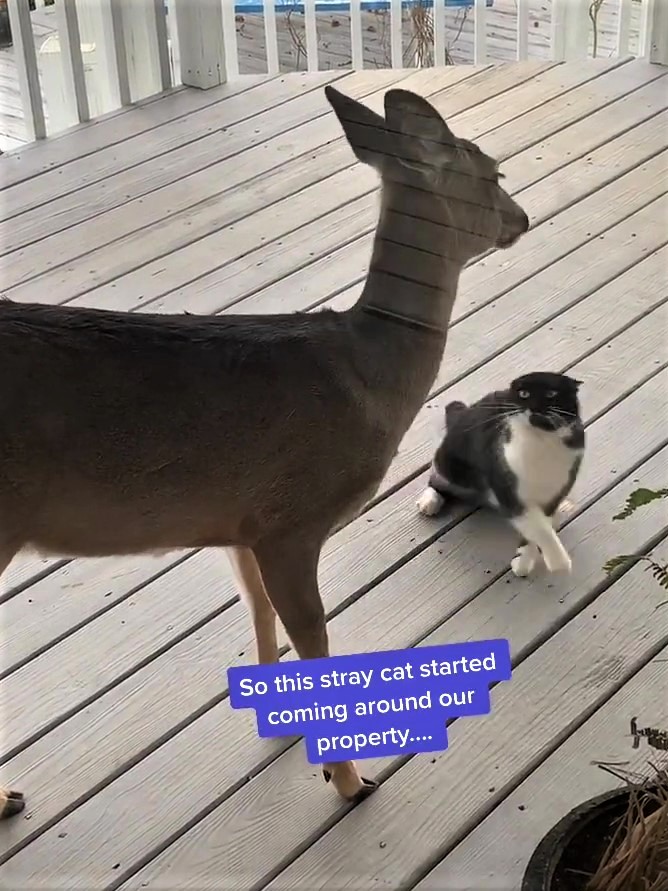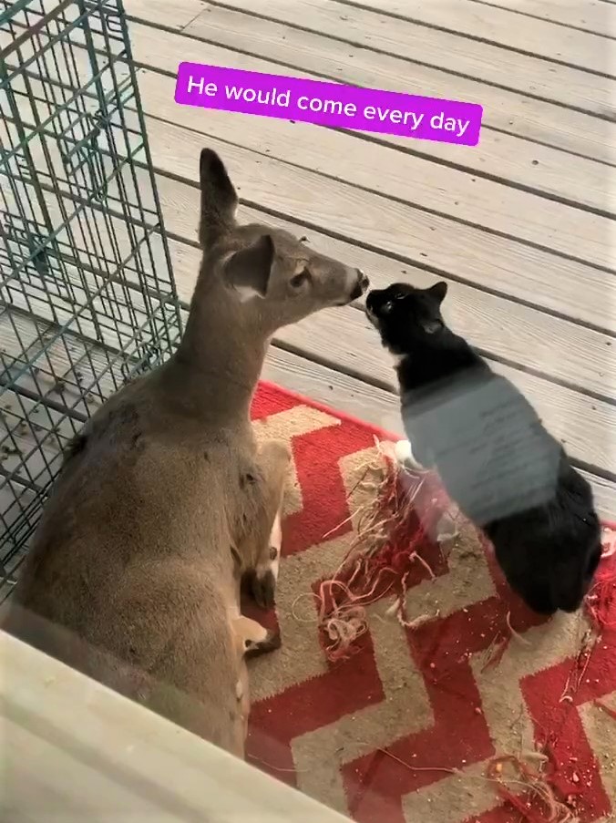 ▼Dottie和O’Malley的感情越來越好,牠們會靠在一起休息,一起玩耍,這跨越物種的友誼非常感人。Cort發現O’Malley每天都來找自家的小鹿後,就在門廊上準備貓糧,讓兩個小夥伴一起吃飯。現在O’Malley已經被餵得胖乎乎,看起來根本不像流浪貓。不過O’Malley還是不願意跟人類接觸,只願意跟小鹿交朋友。