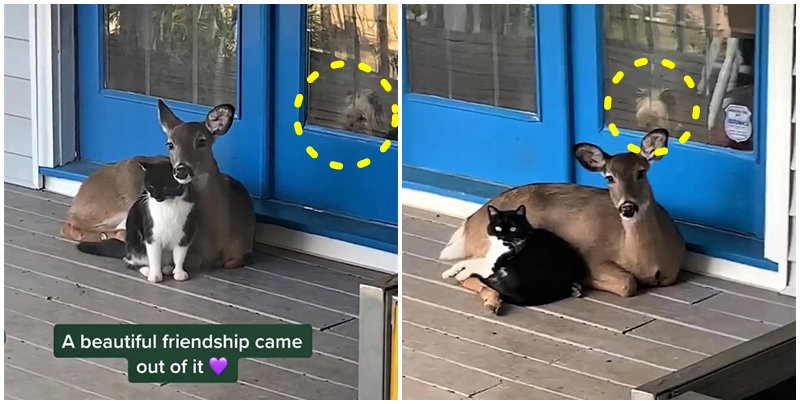 ▼Cort將貓咪、小鹿互動的畫面po到網路上,網友們都被牠們萌翻了。還有眼尖的網友發現,這對小夥伴一起玩耍時,後方的玻璃門內有一隻狗狗正默默看著,眼神非常哀怨。大家忍不住笑說:「你沒說我還真沒注意到有狗狗XD」、「這是有什麼感情糾葛嗎(笑)」、「單身狗在後面」。