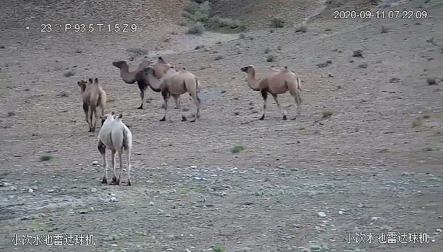 ▼這段影片被拍攝於9月11日,當時11隻野駱駝聚在黃羊溝野生動物飲水池喝水,這隻白色的野駱駝跟其他駱駝形成鮮明的對比。