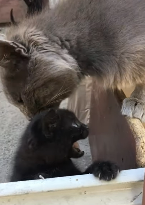 ▼貓爸爸對小貓非常好奇,有一天牠湊過去聞小貓,似乎在說:「這是我的小孩嗎?」小貓不知道貓爸爸在旁邊,一抬頭被眼前的大貓嚇了一跳,連忙躲到媽媽身邊,全身的毛都炸開了。