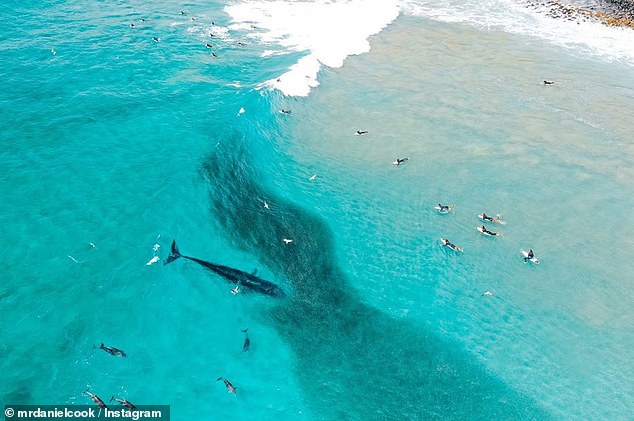 ▼43歲攝影師Daniel Cook偶然將這一幕拍了下來。他表示這一切都是偶然,當時他跟家人一起在海灘度假,家人看到衝浪者和海豚,認為用無人機能拍到更美的畫面,沒想到竟然還有2隻鯨魚。
