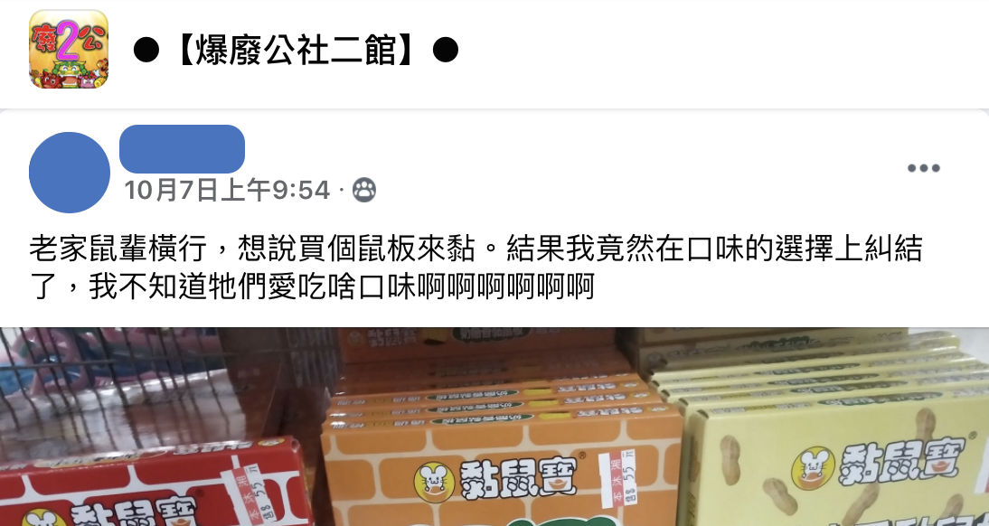 ▼網友在臉書社團發文,表示家中「鼠輩」橫行,於是決定要買黏鼠板來解決鼠患,沒想到到了賣場後他卻是愣住,因為「口味選擇」實在太多,讓他好糾結!只見照片中的黏鼠板,除了一般習以為常的「奶酪(起司)」香味外,竟然還有「落花生香」、「滷肉香」等選擇,要買黏鼠板的原po瞬間愣住、選擇障礙大發作,直呼:「我不知道牠們愛吃啥口味啊啊啊啊!」