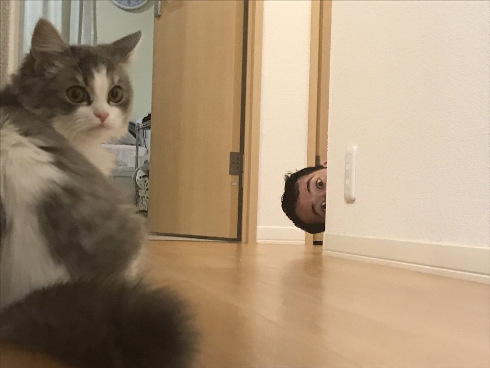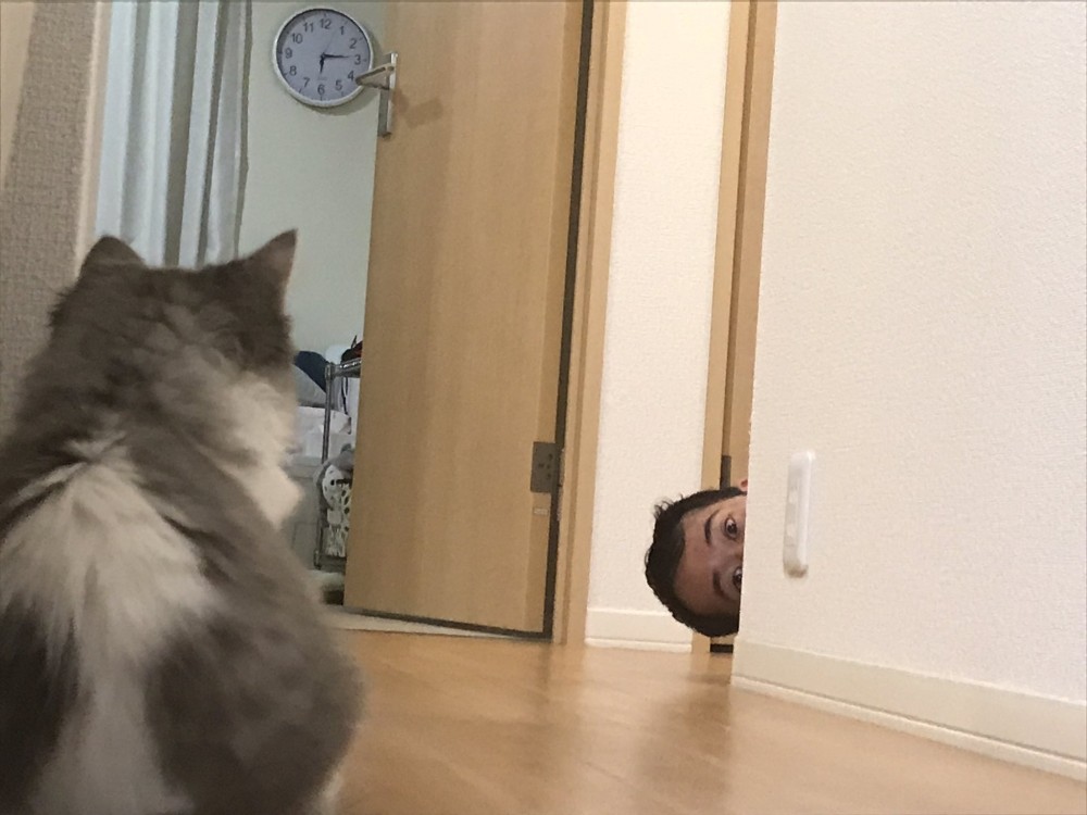 ▼那天推主走出房間,看到老公躺在走廊轉角的地上,只露出一雙眼睛,正以奇怪的方式跟貓咪玩「躲貓貓」。他玩得很認真、很投入,但從貓咪的角度來看,根本就是遇到了癡漢。