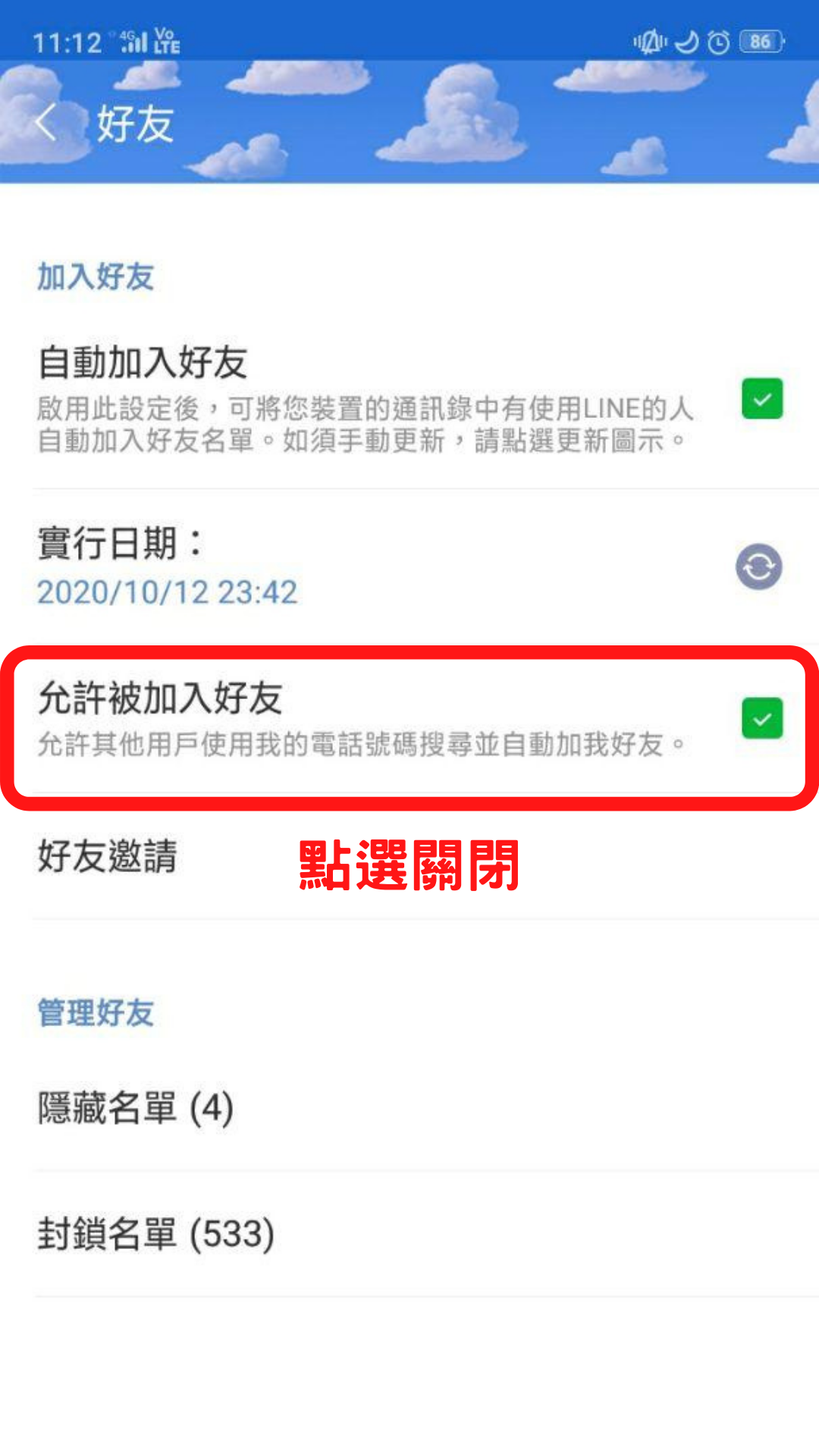 ▼將「允許被加入好友」關閉,這可以無法讓人用你的電話號碼加入你。