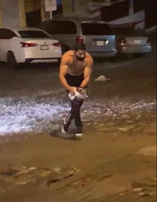 ▼那水流對體型小巧的負鼠來說是可怕的洪水,但對人類來說卻不算什麼。Abraham走到負鼠旁邊,脫下白色T恤包住負鼠,將牠帶到了不會積水的高處。那隻負鼠看起來已經精疲力竭,被他抱著時並沒有動彈。