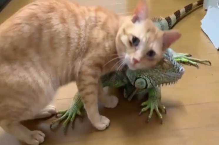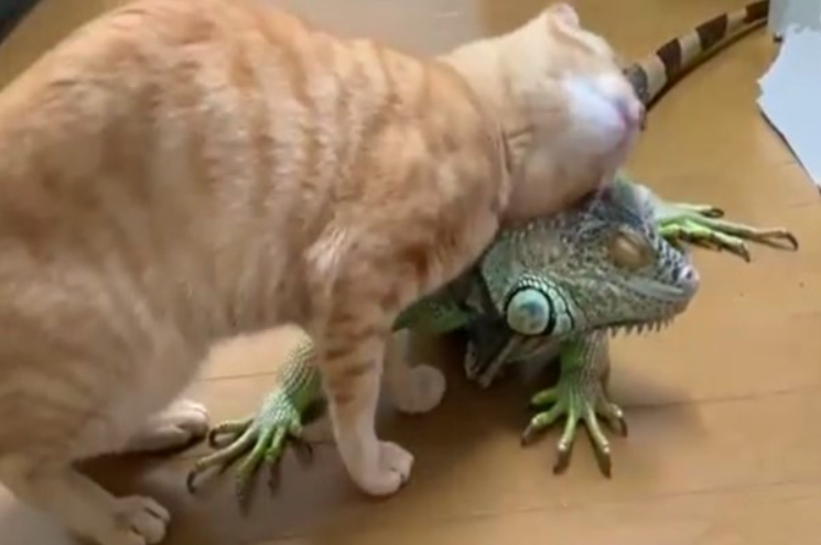 純天然毛梳!橘貓「狂蹭刺刺鬣蜥」 整隻停不下來:太爽啦~