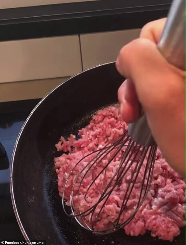 ▼Ami將肉餡放到平底鍋裡,然後用手動打蛋器將肉餡鋪開,變成薄薄的一層,這樣肉餡就能均勻受熱,醬料也能更好地滲入其中。