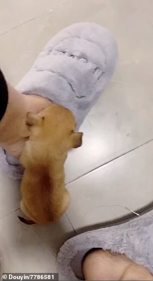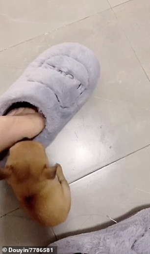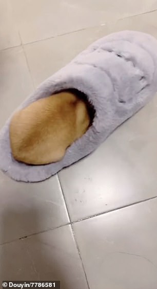 ▼這隻小狗叫「小芝麻」,跟主人生活在哈爾濱。天氣轉冷後,小芝麻最喜歡做的事就是搶主人的拖鞋。主人的拖鞋毛絨絨的,柔軟又厚實,趁熱剛脫下還帶有一點主人角角的溫度,小芝麻待在裡面很溫暖。
