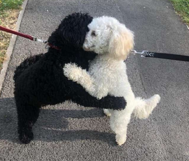 ▼這次Rosie和Monty在散步途中偶遇,一下子就認出了彼此。Susan笑說:「牠們一遇到彼此就開心地跳起來,還互相擁抱。即使10個月沒有見面,牠們還記得對方,真是太驚奇了!」