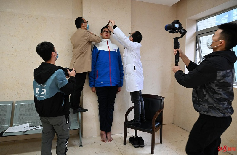 ▼小宇目前正在讀國中9年級,10月18日這天他度過了自己的14歲生日,也是在這一天,他申請認證為「世界最高的青少年」。金氏世界紀錄的認證官特別趕到樂山市,早中晚3次給小宇測量身高,還測量了他的站高、躺高、臂跨、手跨、手掌寬、腳掌寬等數據,最後確定他的身高為221公分。