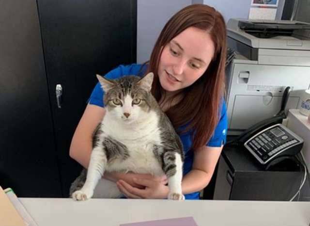 ▼Fred原本住在收容所,被帶到獸醫院時體重已經有十幾公斤。雖然牠體重驚人,但並不懶散,反而非常活潑,尤其喜歡跟人交朋友。這隻友善的貓咪很快就成為獸醫院的吉祥物,每天負責待在門口迎客。