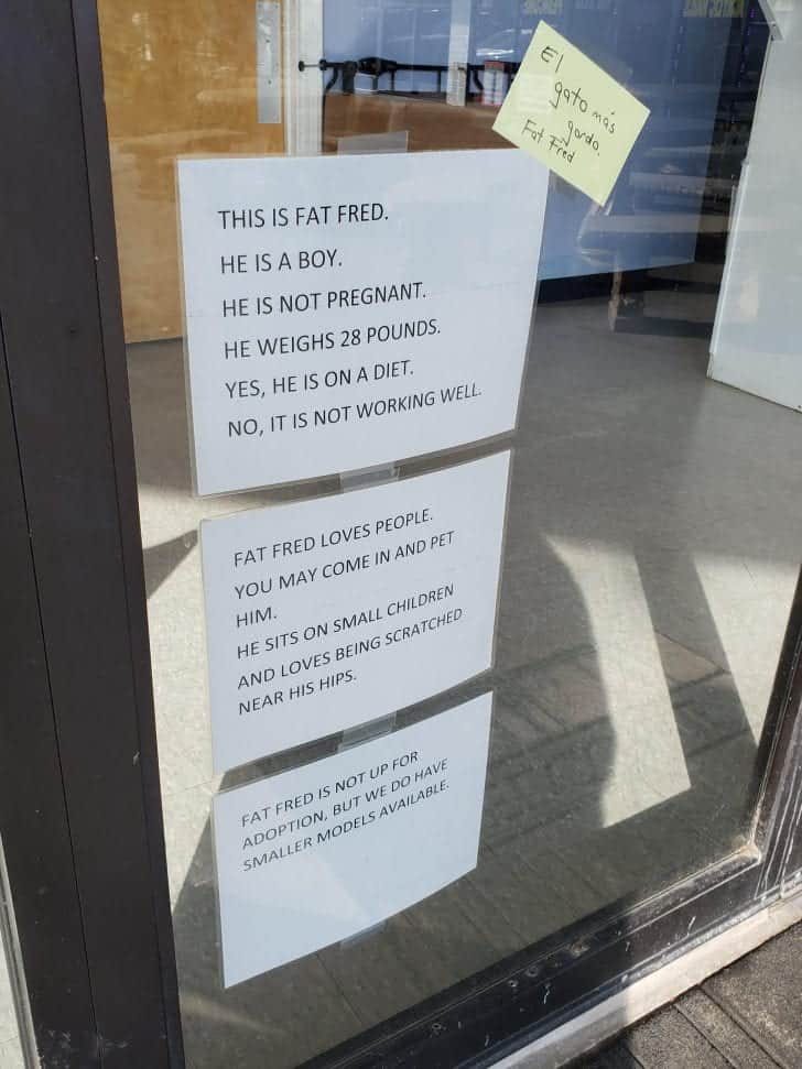 ▼告示上寫著:「牠叫胖Fred,是個男孩子,沒有懷孕,只是胖而已。牠現在已經12公斤重了,雖然正在節食中,但是成效不佳。Fred喜歡每一個人,你可以進來摸摸牠,牠喜歡被摸屁屁,也喜歡坐在小朋友身上撒嬌。Fred並不開放領養,但是如果您喜歡毛孩的話,我們這裡也有一些『較小的』的貓咪可以領養喔!」
