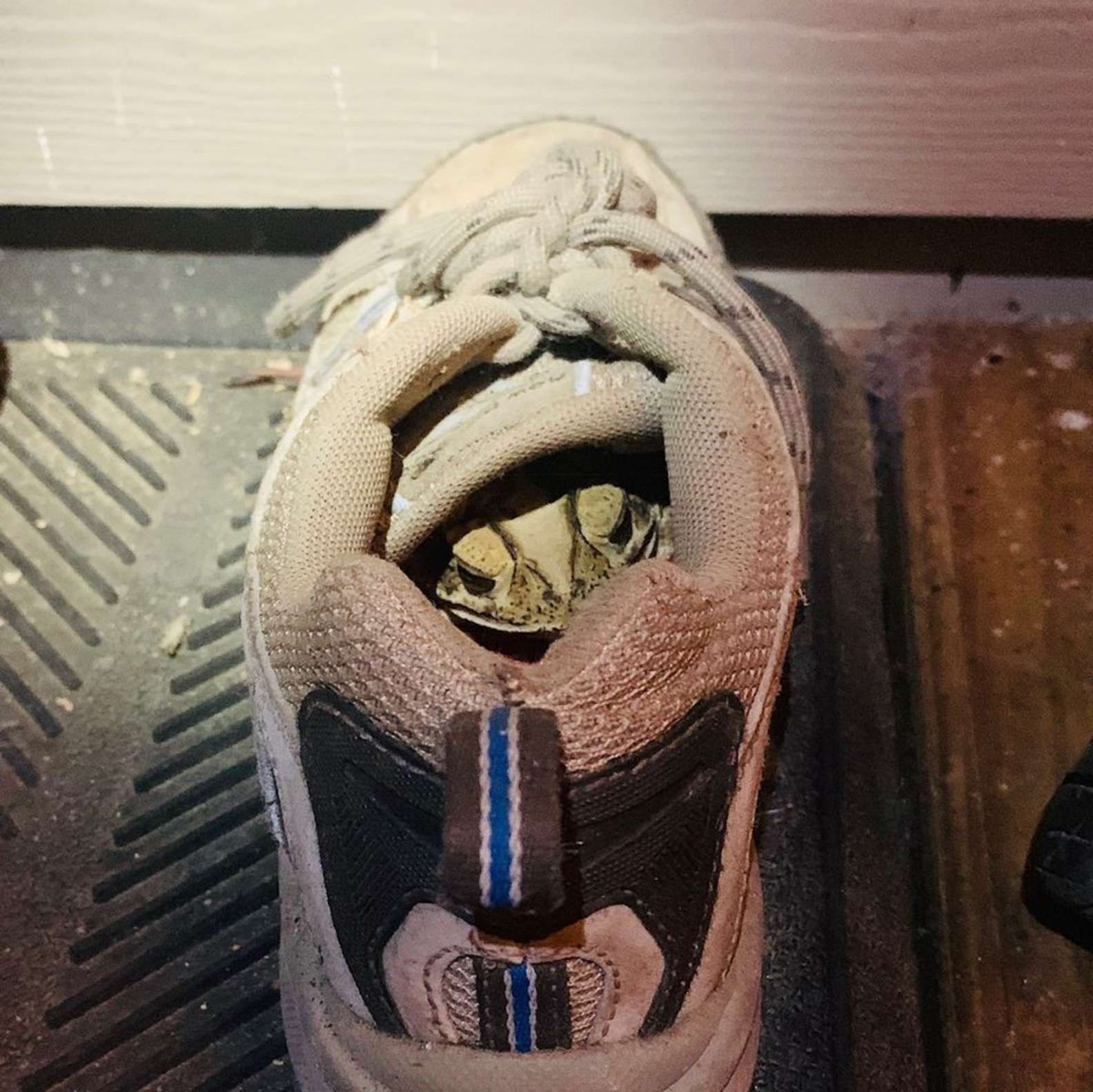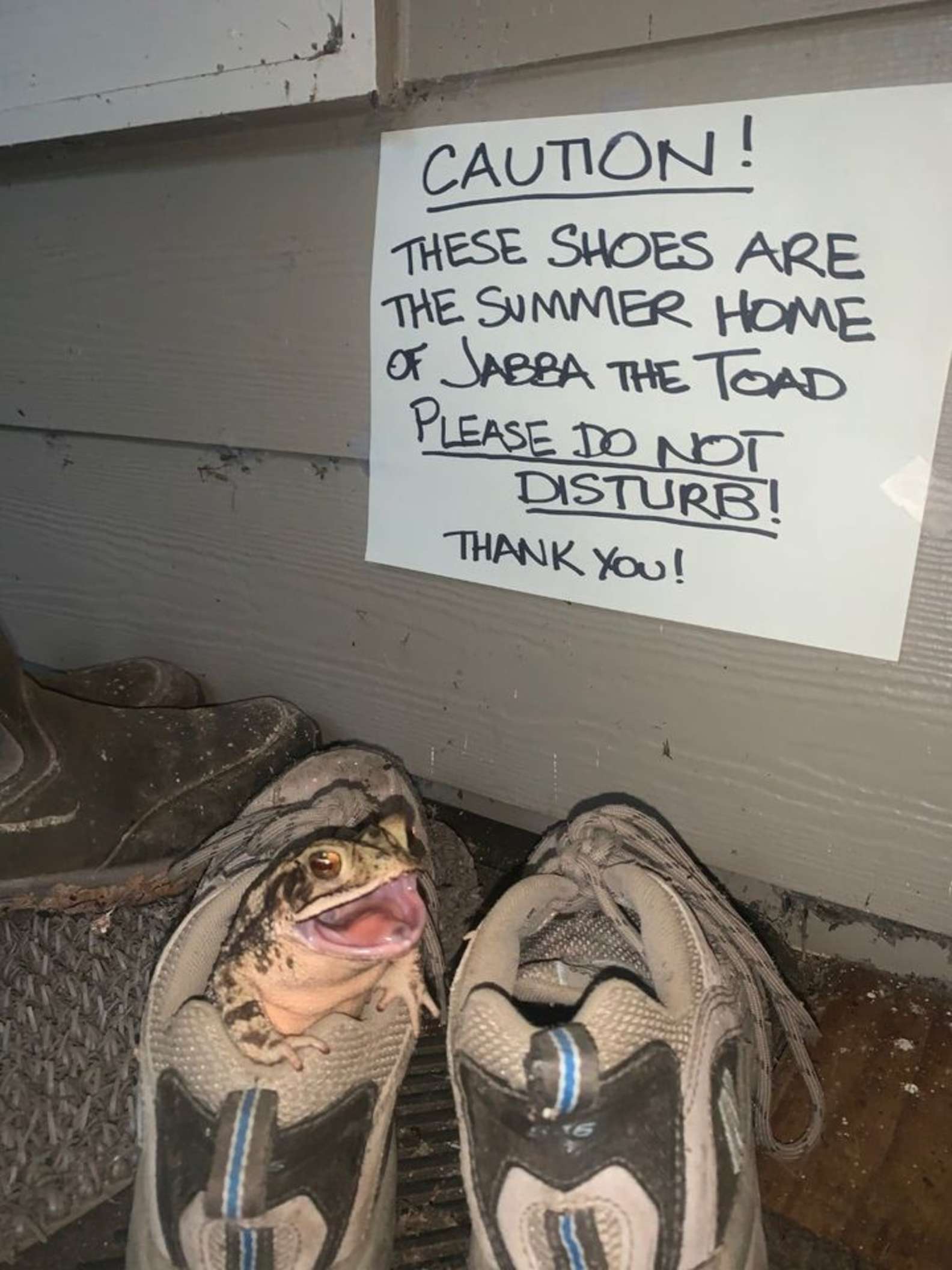 蟾蜍把球鞋當成「度假小屋」 搬進去「連住2年」她貼告示:噓...不要吵到牠!