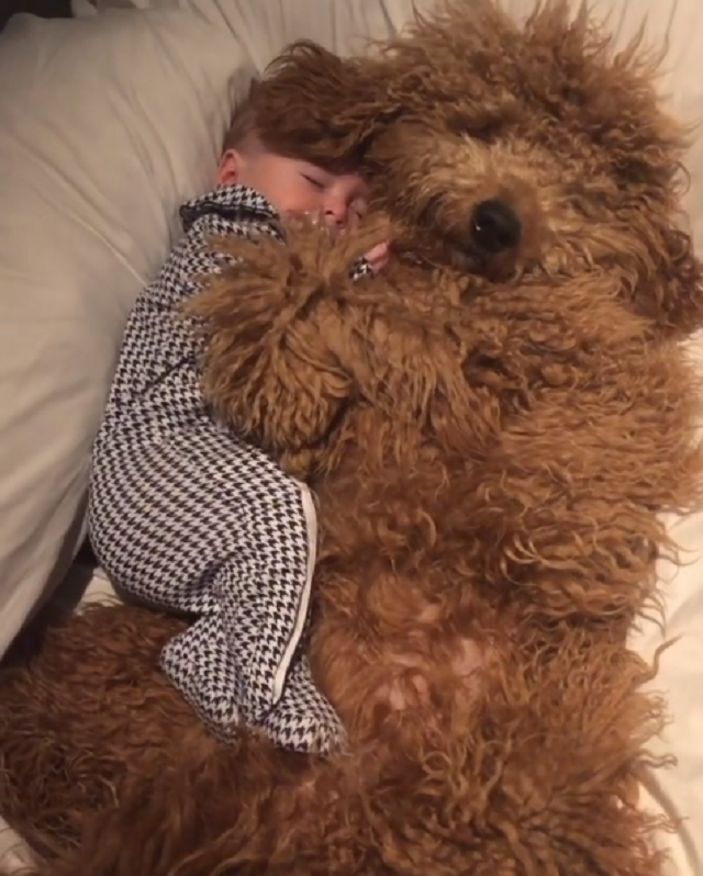 ▼媽媽Jessica表示,Theo和狗狗們感情非常好,他每天小睡時都會這樣抱住其中一隻狗狗,睡15到30分鐘。狗狗們乖乖陪Theo睡覺,給Theo提供滿滿的安全感,就像一個大號的泰迪熊娃娃。