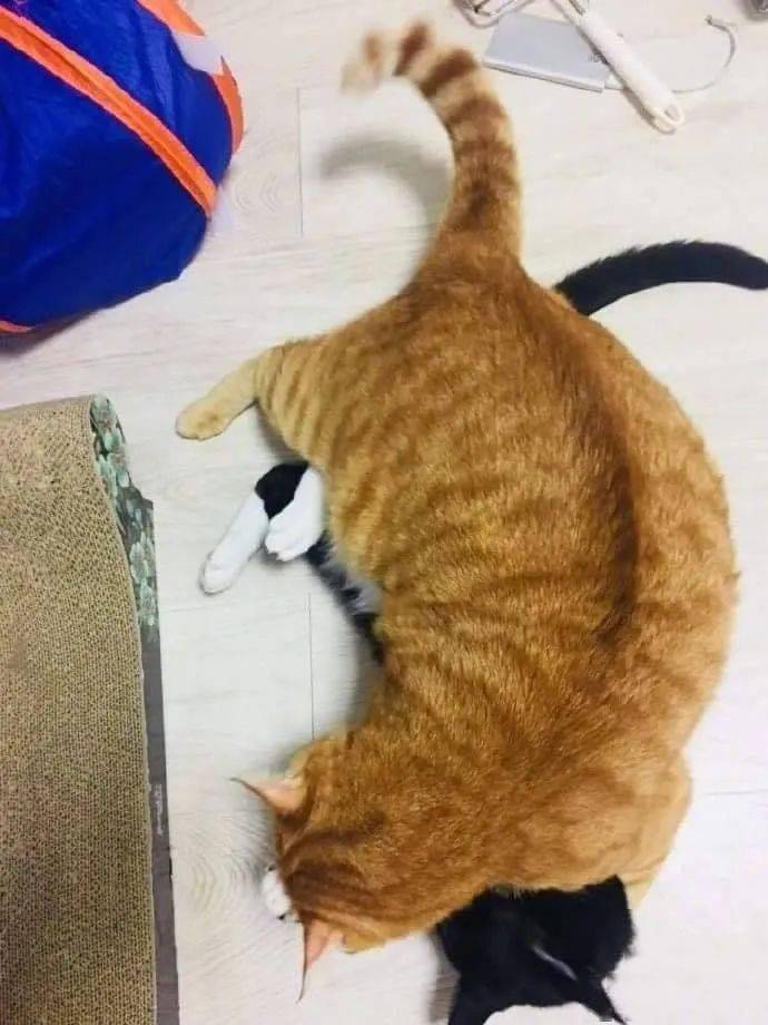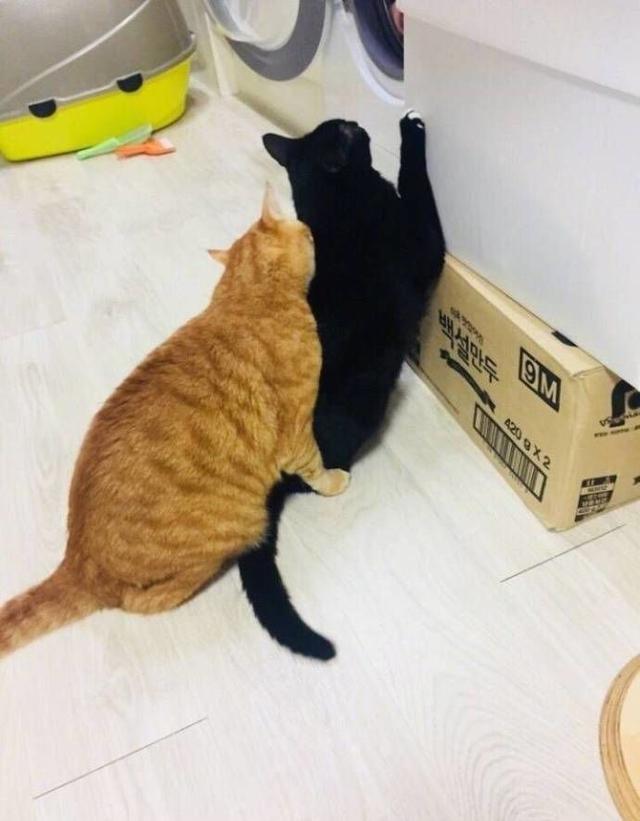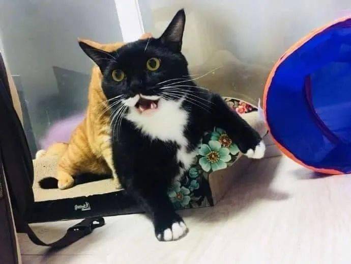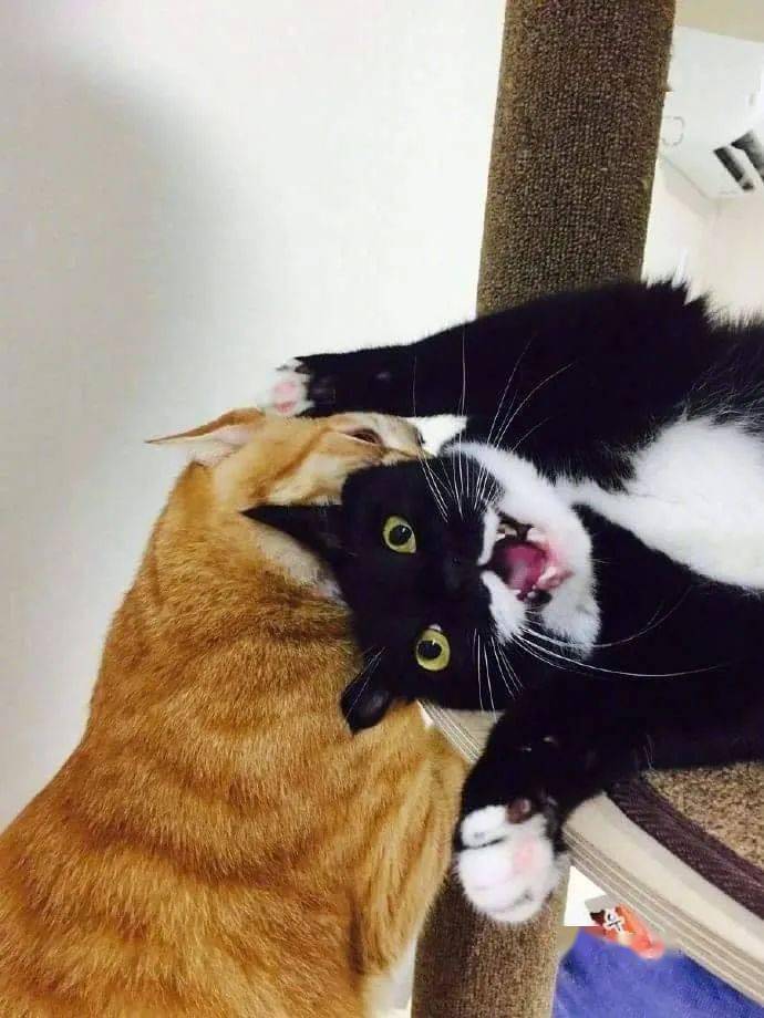 這下黑白貓應該不敢再找橘貓麻煩了吧。毛孩之間小小的玩笑、鬧事很正常,但如果吵架情況太過火的話,主人還是先把牠們隔開比較好,畢竟安全最重要~