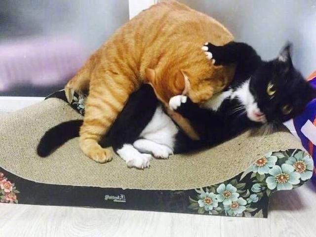 ▼那天黑白貓看到橘貓經過,又像往常一樣挑釁人家。沒想到這次橘貓忍無可忍、不能再忍,終於決定反抗起來。只見橘貓用不符合身材的敏捷動作、非常迅速地追上黑白貓,一轉眼便將黑白貓壓在身下,運用體重、身材優勢使出大絕招「百萬噸重壓」,讓黑白貓完全被壓制住、無處可逃。