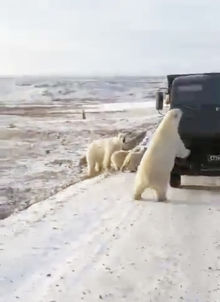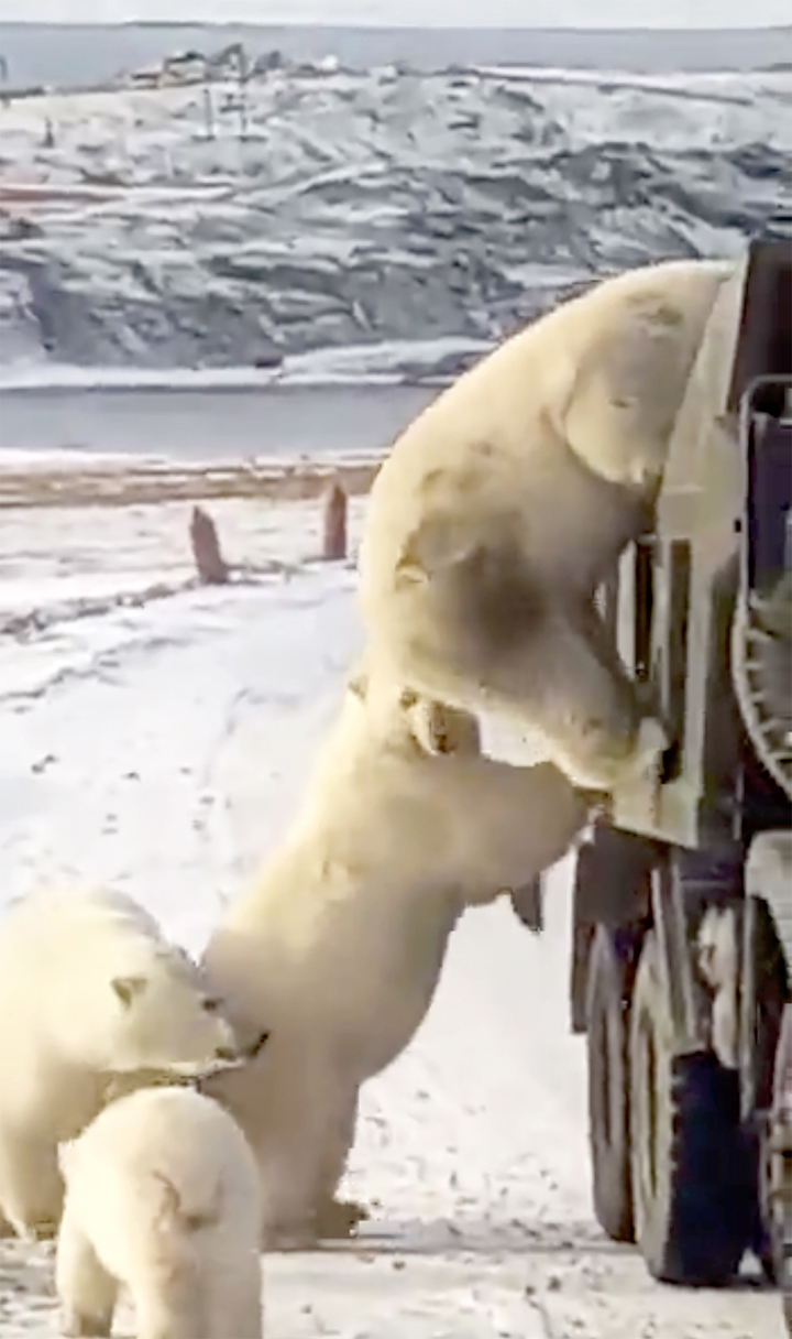 2020年10月27日近年來全球暖化氣溫升高,極地冰川加速融化,導致北極熊的棲息地逐漸縮小。牠們的飲食習慣也改變了,更傾向於來到陸地上找食物。日前俄羅斯就出現了讓人鼻酸的一幕,只見一群北極熊當街攔截垃圾車,甚至爬到垃圾車車斗裡翻找廚餘吃,顯然已經餓到不行。