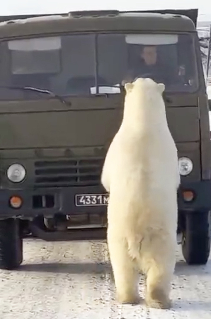 ▼在北極圈內的俄羅斯新地島(Novaya Zemlya Islands),一輛垃圾車疑似拋錨,停在路中央。約10隻北極熊聚攏過來,爬到後方車斗里翻找廚餘吃。還有北極熊走到車子前面,將臉貼在擋風玻璃上跟駕駛對視。北極熊寶寶們爬不上車,就在旁邊探頭探腦。