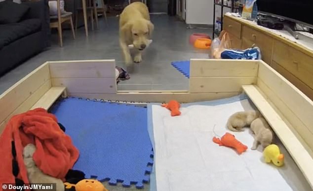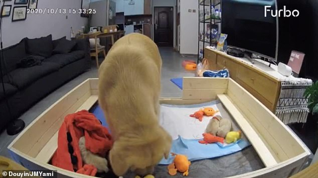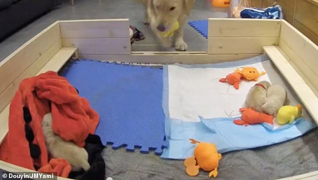 ▼黃金獵犬Yami在10月初剛剛生下了3隻小寶寶,這也是Yami第一次當媽媽,作為一名新手媽媽Yami照顧寶寶還不是很熟練,幸好有主人幫忙。但是一天當主人有事外出的時候,狗寶寶突然鬧了起來,這可把Yami急慌了,手足無措地在客廳走來走去,絞盡腦汁思考怎樣才能夠安撫住寶寶。