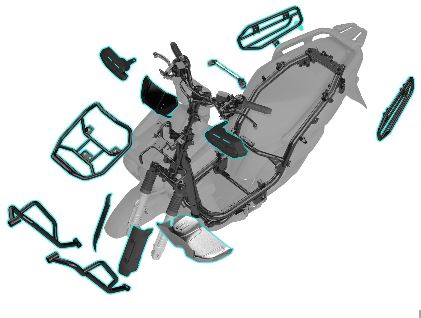 ▼在懸吊制動方面,採用前245mm碟盤搭配單向雙活塞、後230mm碟盤搭配單活塞設定,並標配有UBS前後連動煞車系統,但未有ABS可供選用;避震器則是前正叉、後避震4段預載可調,同時不對稱車架強度較過去提升25%,再配合巧克力胎與輕量化輪圈,提供優異的越野能力。