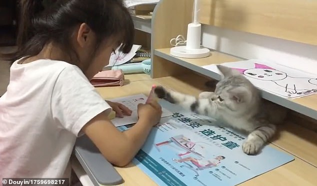 ▼仔仔和主人生活在江蘇,那天主人拍下了牠打擾女兒寫功課的一幕。從影片中可以看到,小女孩正專心寫功課,仔仔則懶洋洋躺在書桌上,不時伸手干擾小主人,想讓她關注自己。仔仔似乎在說:「枯燥的功課太無聊了,不如跟我玩吧!」