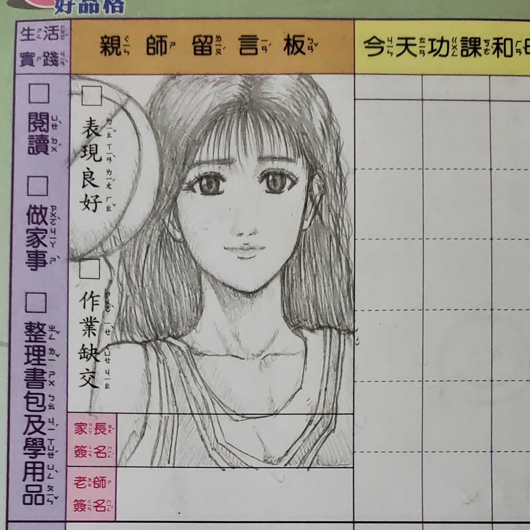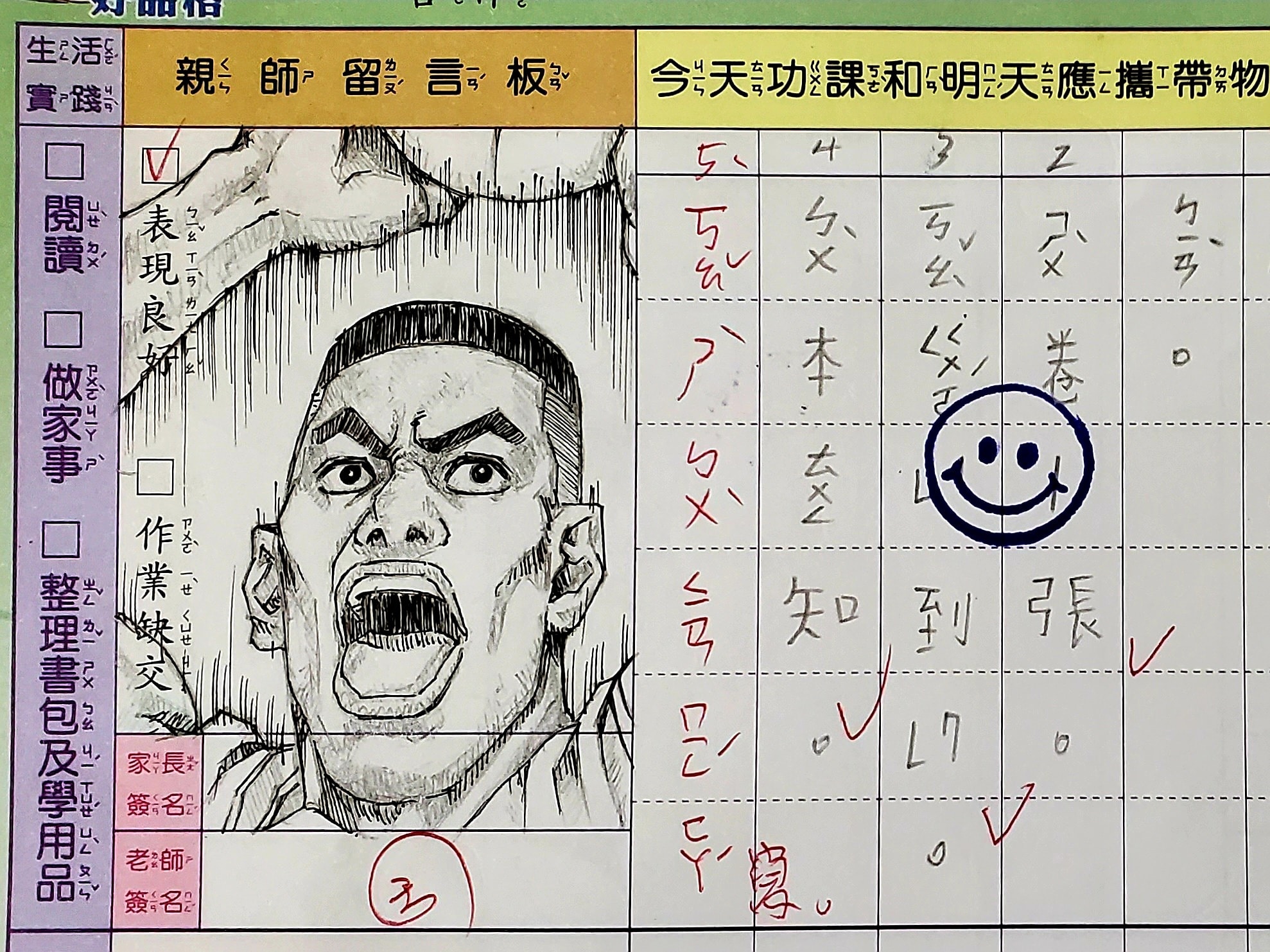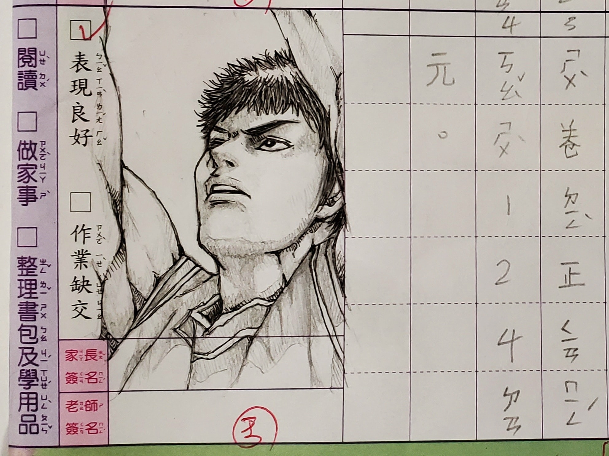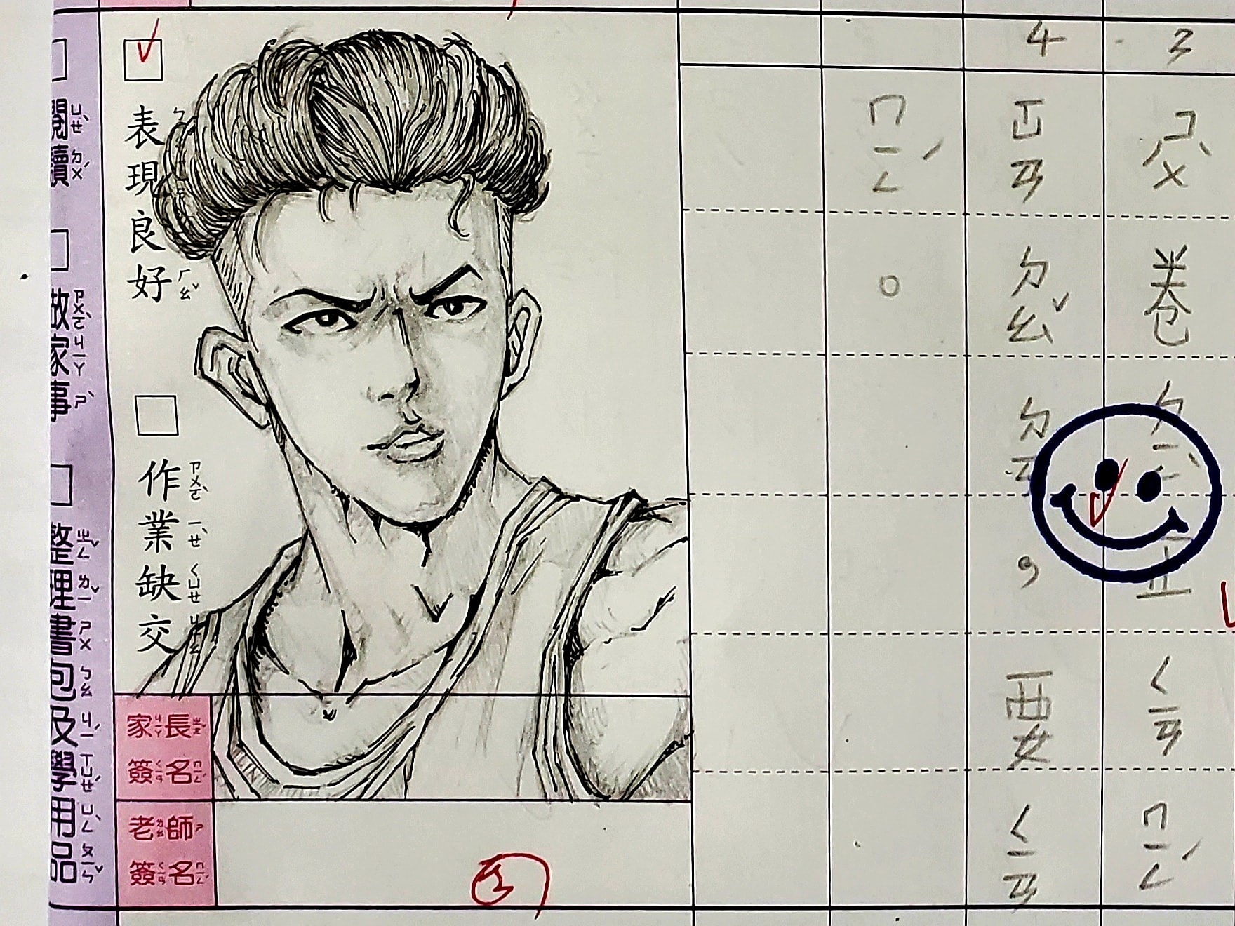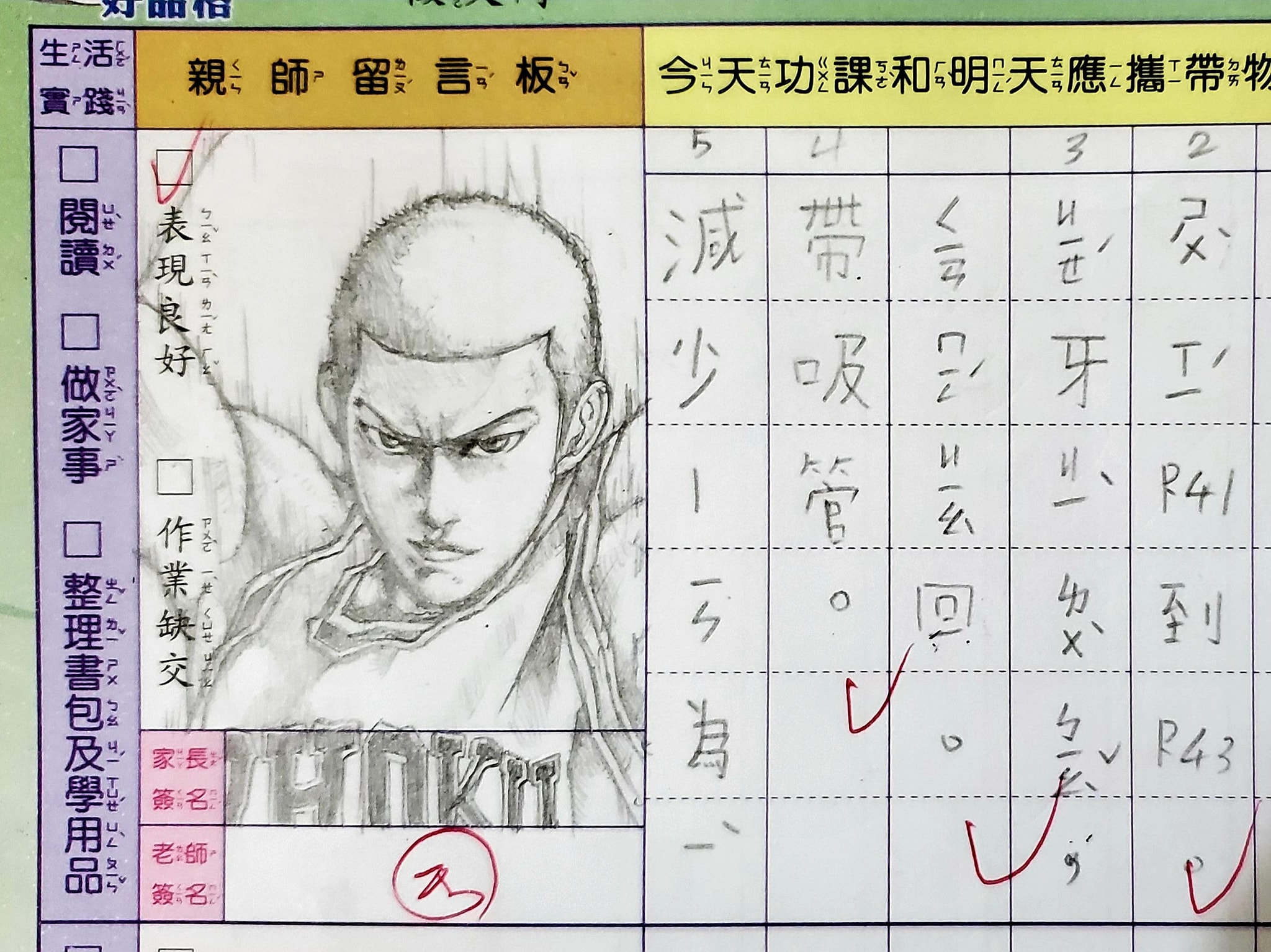 2020年10月30日現在的孩子每天都要寫家庭聯絡簿,學校會要求家長天天簽名,了解孩子在學校中的狀況。一位創意十足的老爸在聯絡簿上簽名後,竟然開始畫畫。他在親師留言版畫超細緻的動漫角色,最近還在臉書社團「爆廢1公社」po文說:「我終於把湘北籃球隊簽完了!」