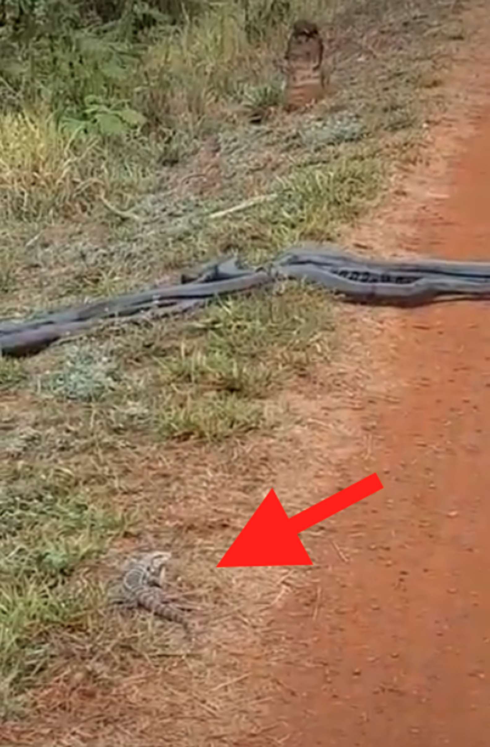 ▼除了這群學生,還有一隻蜥蜴也在等待森蚺過馬路。牠在不遠處定格,等體型龐大的森蚺經過後再回家。學生們看到這一幕都很驚喜,將照片、影片po到網路上,跟網友們分享這珍貴的經驗。