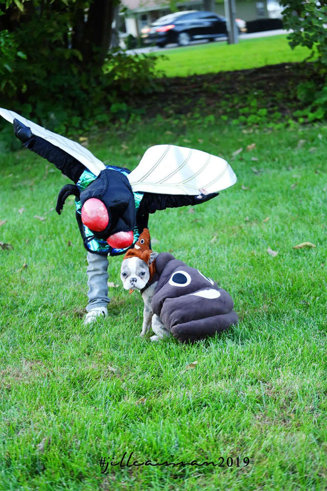▼之前Tyler的親戚送給他一套搞笑的蒼蠅裝。Tyler裝扮成蒼蠅的話,Stoli該怎麼裝扮才能搭配呢?蒼蠅最愛的就是便便,不如Stoli裝扮成便便吧!