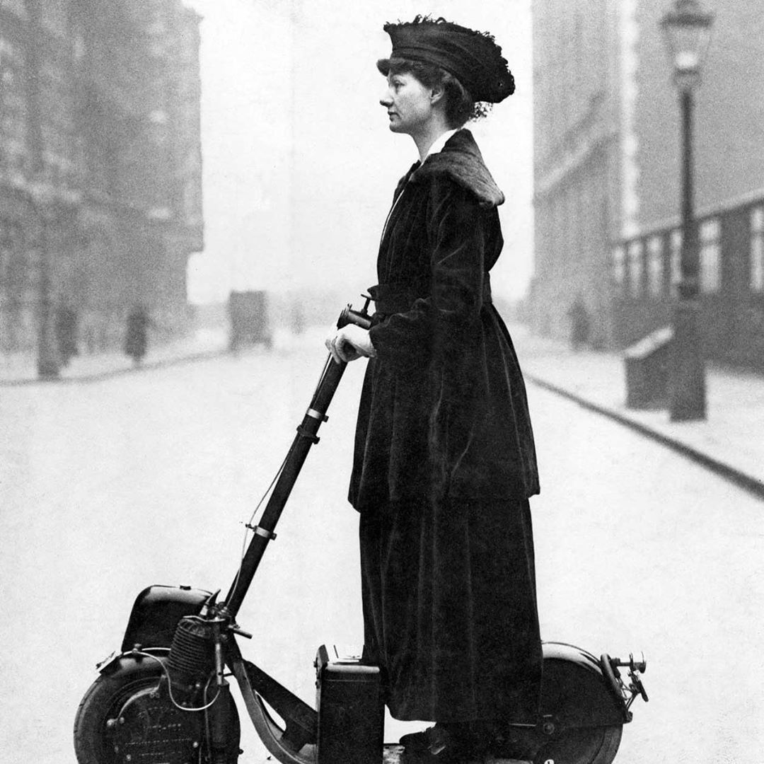 ▼1916年,這名婦人正在駕駛類似如今機車的移動器。