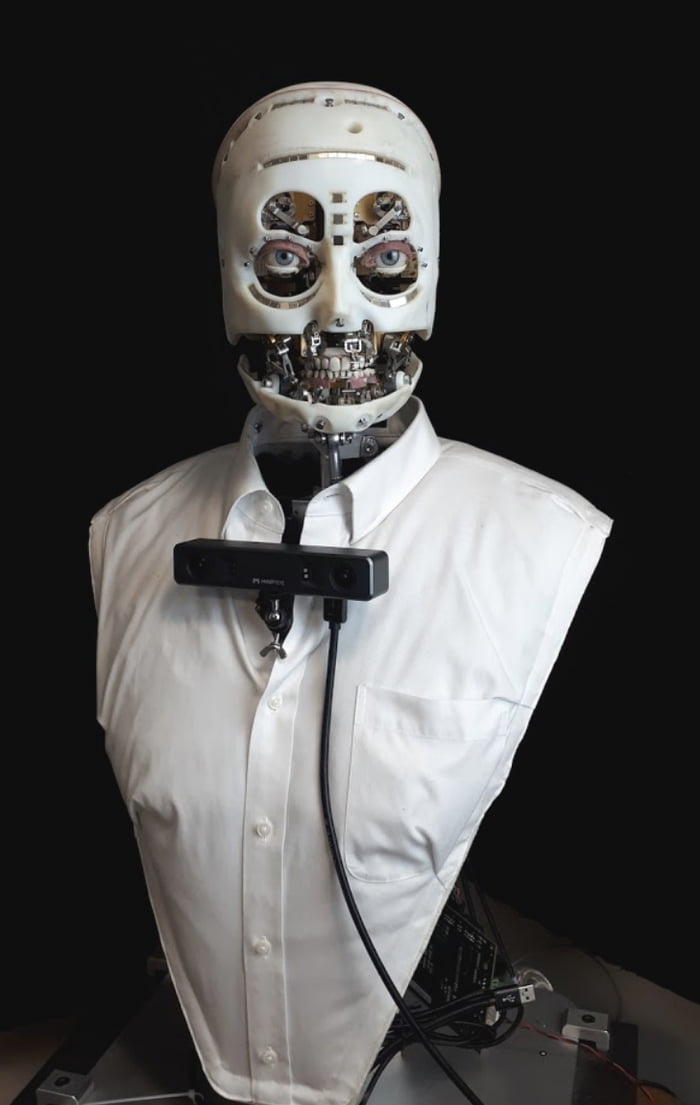 ▼機器人接收到周圍不同的訊號後,就能做出不同的反應,並調整視線,這樣看起來臉部不會太僵硬。不過新型機器人還在開發中,臉部沒有覆蓋上皮膚,只有眼睛靈活生動,看起來怪怪的。