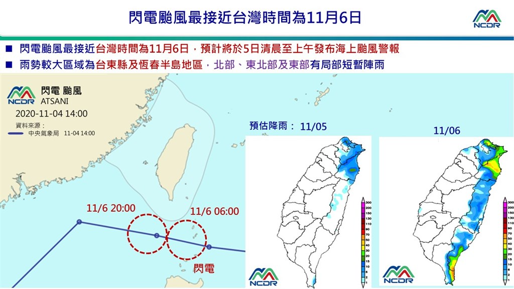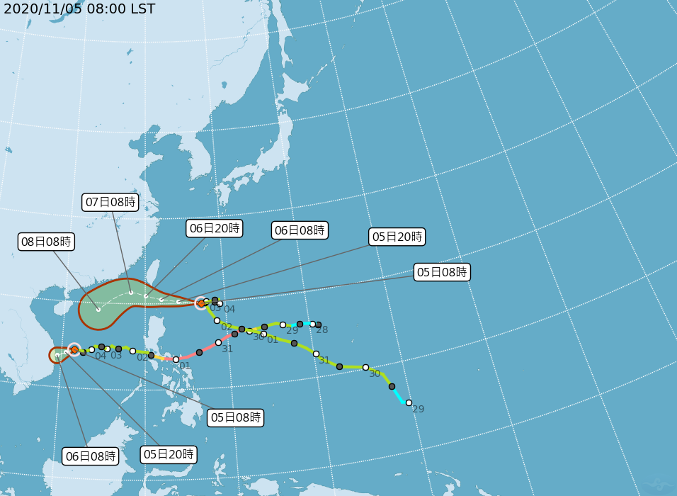 2020年11月05日今年第20號颱風「閃電」來勢洶洶,中央氣象局在今天上午8時30分發布海上颱風警報,颱風中心目前在鵝鑾鼻東南方東方海面,向西移動,正逐漸朝巴士海峽接近,據觀測,颱風強度持續增強、範圍也有擴大的趨勢;目前已發布海警,在路徑持續偏北的情況下,氣象局最快今天傍晚就會發布陸上颱風警報。