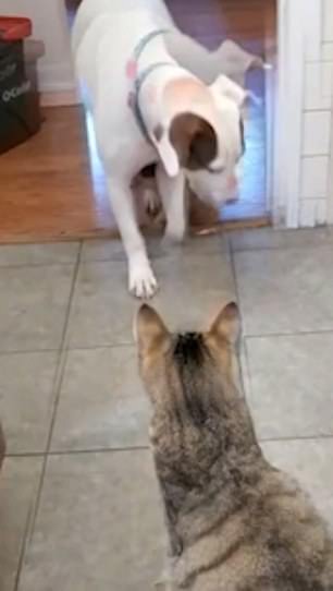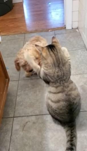 貓咪欺軟怕硬!面對小狗「喵拳出擊」 看牠找來大狗秒孬:今天先休戰!