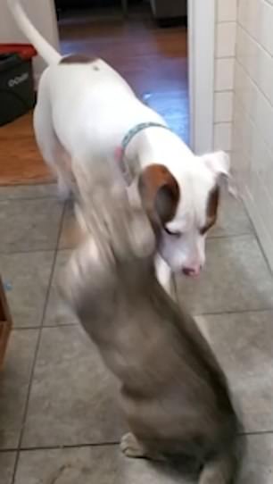 ▼Louie是一隻很聰明的狗狗,牠在浴室門口坐了一會兒,就想出了解決辦法,那就是找幫手!Louie找來Leela幫忙,Marvin看到體型比自己大很多的Leela,態度立刻改變了!
