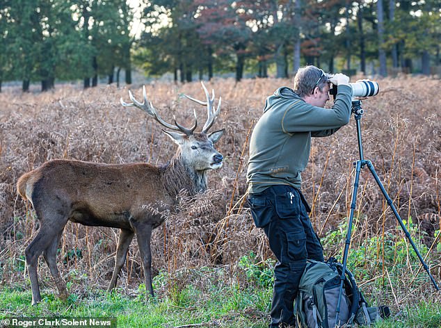 2020年11月09日野生動物攝影師想要拍到一張好照片,可能要等很長時間~日前75歲攝影師Roger Clark在倫敦灌木公園(Bushy Park)中拍到了很有趣的一幕。另一位攝影師專注工作時,竟有一隻雄鹿悄悄走到了他的身後。