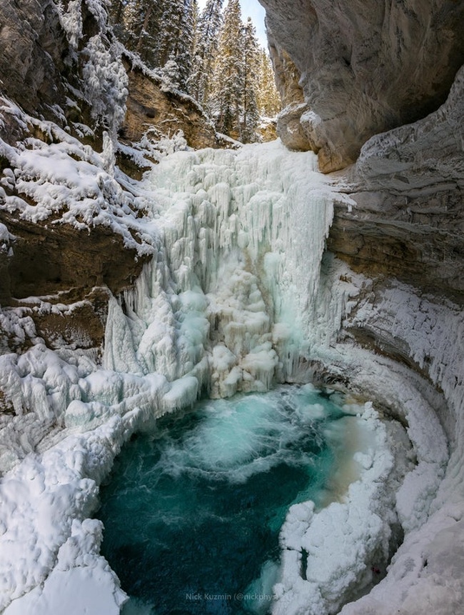 ▼加拿大班夫國家公園中的瀑布結冰了。