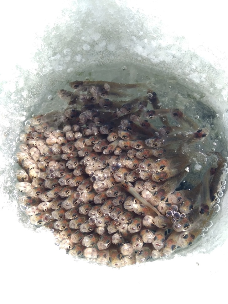 ▼河面結冰,魚兒們集中在冰孔周圍吸取氧氣。