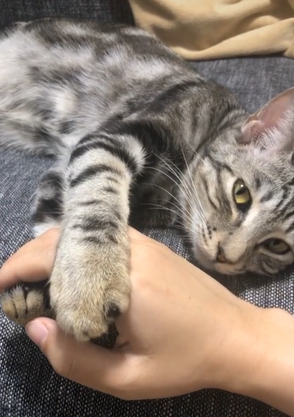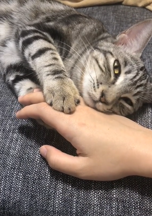 ▼影片中的貓咪正躺在沙發上度孤。牠將下巴靠在主人的手上,還用前爪輕輕抱著主人的手指。主人看貓咪睡著,想將手抽出來,原本以為貓咪睡得那麼香甜,應該不會有感覺,沒想到牠竟然馬上察覺到主人的意圖,下一秒就醒來,盯著主人看。