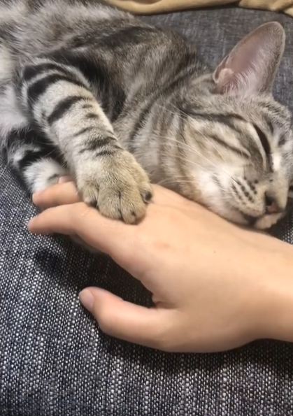 ▼貓咪感覺到主人的手緩緩抽離,立刻睜開眼睛。牠睡眼矇矓,帶著半睡半醒的嬌憨,霸氣將主人的手拉過來,還用腳掌一勾,將手固定在下巴處,然後抬頭看向主人,似乎在說:「不要走,留下來陪我!」