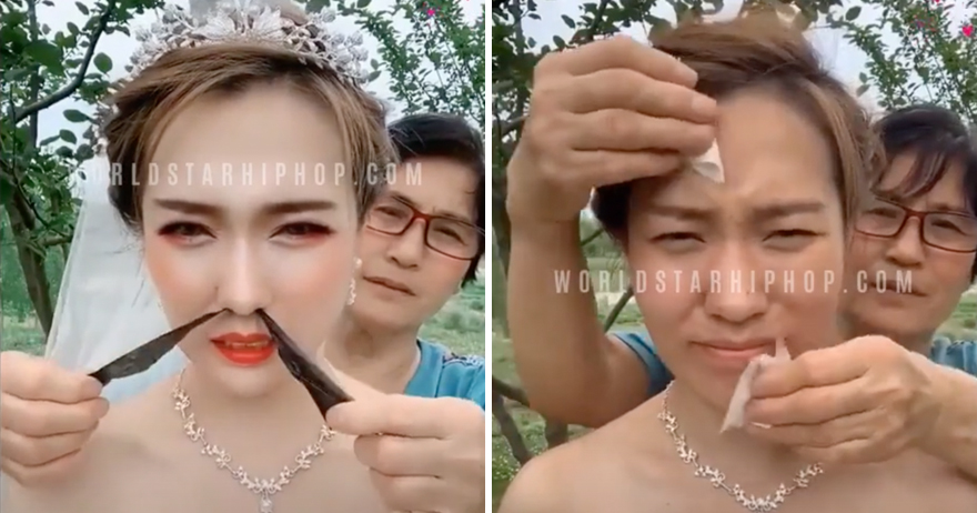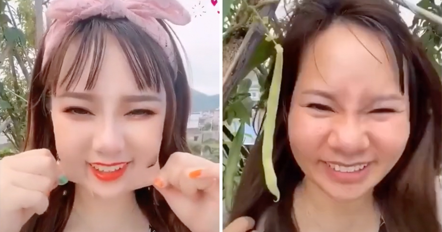 ▼除了上面的對比圖,還有一段「變臉」影片討論度超高。這些女生直接在鏡頭前卸妝,她們有的從臉頰上拆掉什麼東西,還有的從鼻孔裡抽出什麼東西,對比效果很驚人。