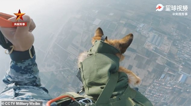 ▼叮當跳傘過程中身姿矯健,幾分鐘後王眾帶著叮當在指定降落地點降落。