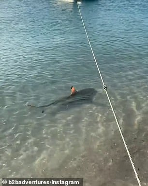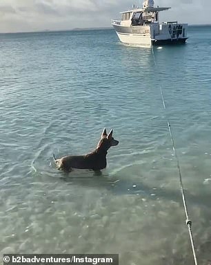 ▼鯊魚被驅離後,Tilly還不放心,到更深的水域去尋找一番,確定鯊魚真的離開才回到岸上休息。