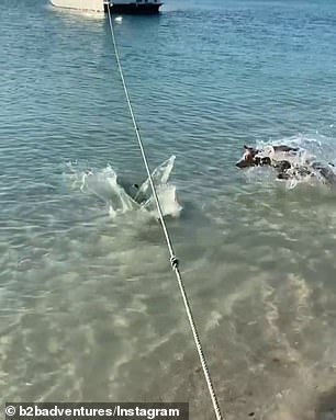▼Tilly看到鯊魚在淺灘徘徊,似乎對自己的主人虎視眈眈,於是毫不猶豫沖進水裡,甚至跳向鯊魚。牠的動作引起巨大的浪花,擋住了鯊魚的視線。