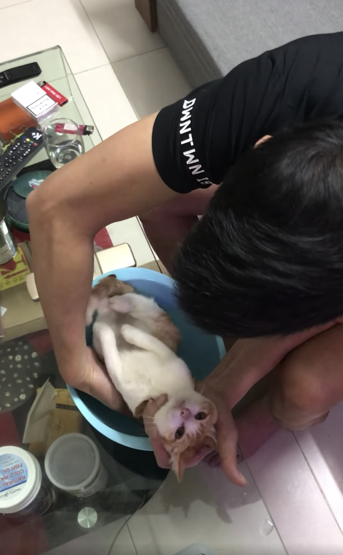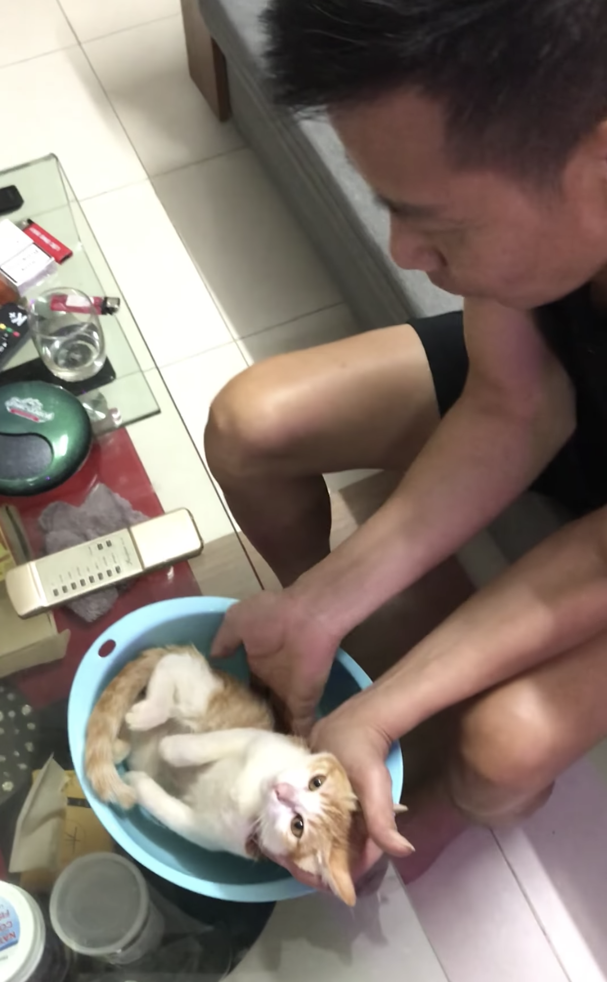 ▼這是一位馬來西亞網友拍攝的影片,po文指出,爸爸正在教兒子怎麼幫嬰兒洗澡。他手中捧著貓咪當成模特兒來示範,一邊解釋洗澡的步驟,一邊溫柔撫摸小貓。