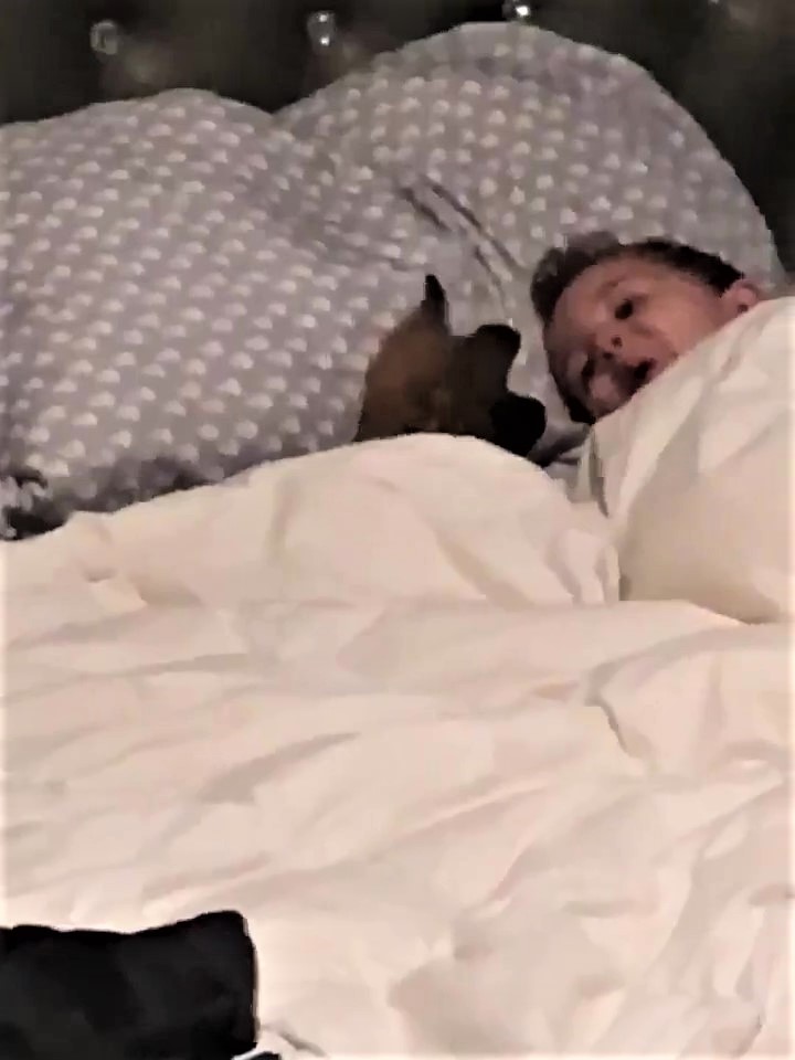 ▼再來看房內,只見小男孩和狗狗窩在床上,他先仰頭叫一聲,狗狗也跟著叫。