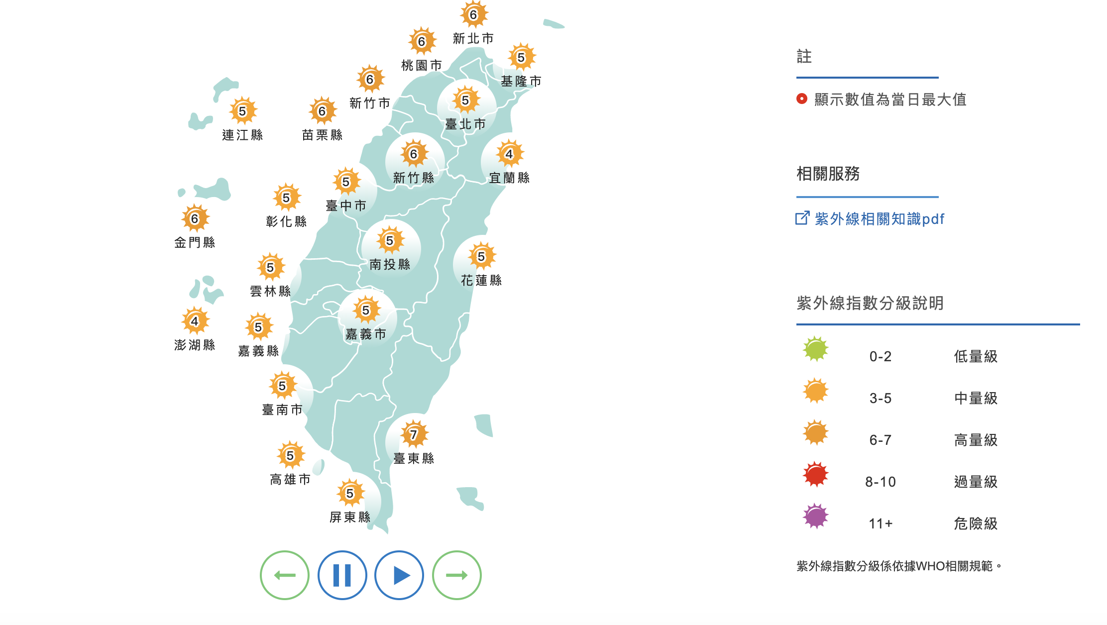 ▼未來數天北台高溫升至30度左右。周二至周五各地晴朗穩定,高溫可達31度以上,白天微熱、紫外線強,為典型秋老虎的天氣型態。氣象局表示雖然白天暖、甚至「微熱」,高溫可達30度上下,但各地清晨低溫仍可到19度,要注意保暖;今日紫外線預報,新北市、桃園市、新竹縣、新竹市、苗栗縣均來到「高量級」,其餘各縣市也來到「中量級」,呼籲民眾不僅要注意早晚保暖,也要注意防曬!