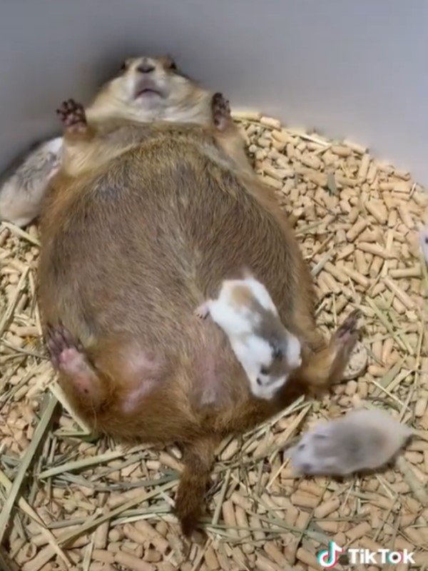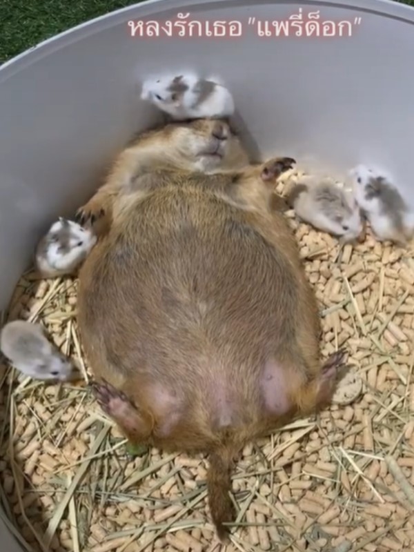 ▼影片中的這隻土撥鼠胖乎乎的,牠仰躺在窩中,圓滾滾的肥肚看起來很Q彈。牠睡得正香,身邊有5、6隻小倉鼠跑來跑去開心玩,牠也完全不在意,自顧自沈浸在夢鄉裡。