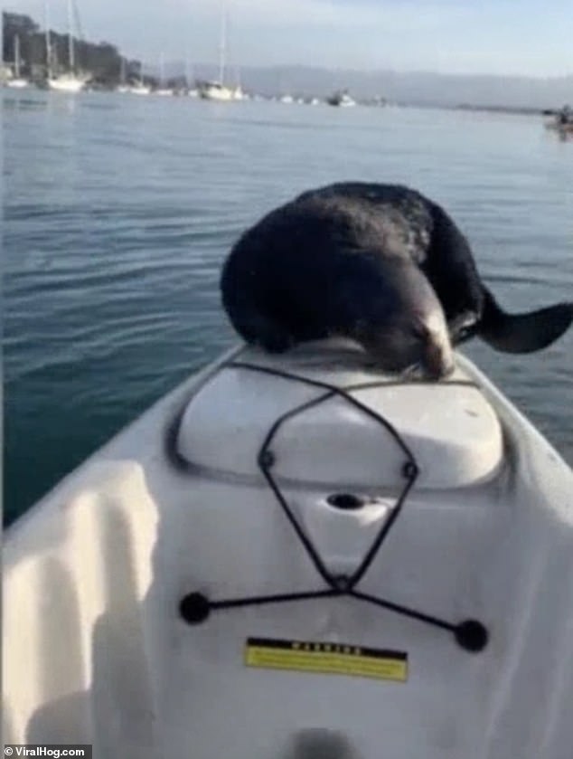 ▼海獺來到另一邊,終於跳上獨木舟,但牠沒有停留太久,馬上就溜走了。接下來牠又跳上獨木舟好幾次,確定沒有安全問題才趴下休息。牠在獨木舟上這邊聞聞、那邊嗅嗅,似乎非常好奇。