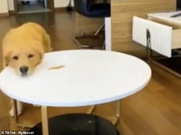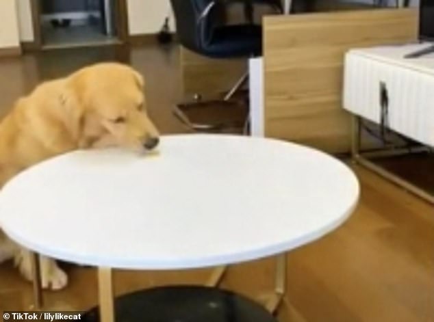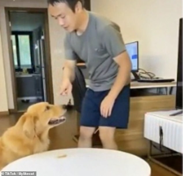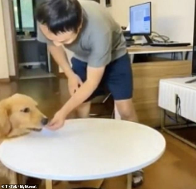 ▼主人回來後看到桌子上有肉乾,還以為金金通過測試,忍住了自己的食慾,於是把肉乾獎勵給牠吃。他沒想到這已經是金金吃到的第二塊肉乾啦。