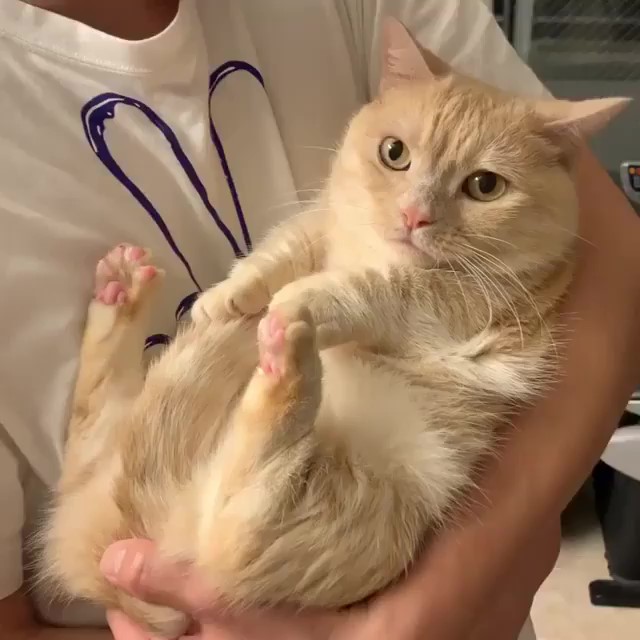 網友們看到這段影片紛紛表示:「這隻溫柔系的」、「小短腿太迷人了」、「我只注意到牠的粉紅肉球」、「舉手say no」、「一直舉左手好可愛」、「一點都不兇啊」、「喵:先…先不要」。把拔那麼愛玩,myu只能一直舉著左手,時間久了手也會酸,牠無奈的表情太可愛啦~