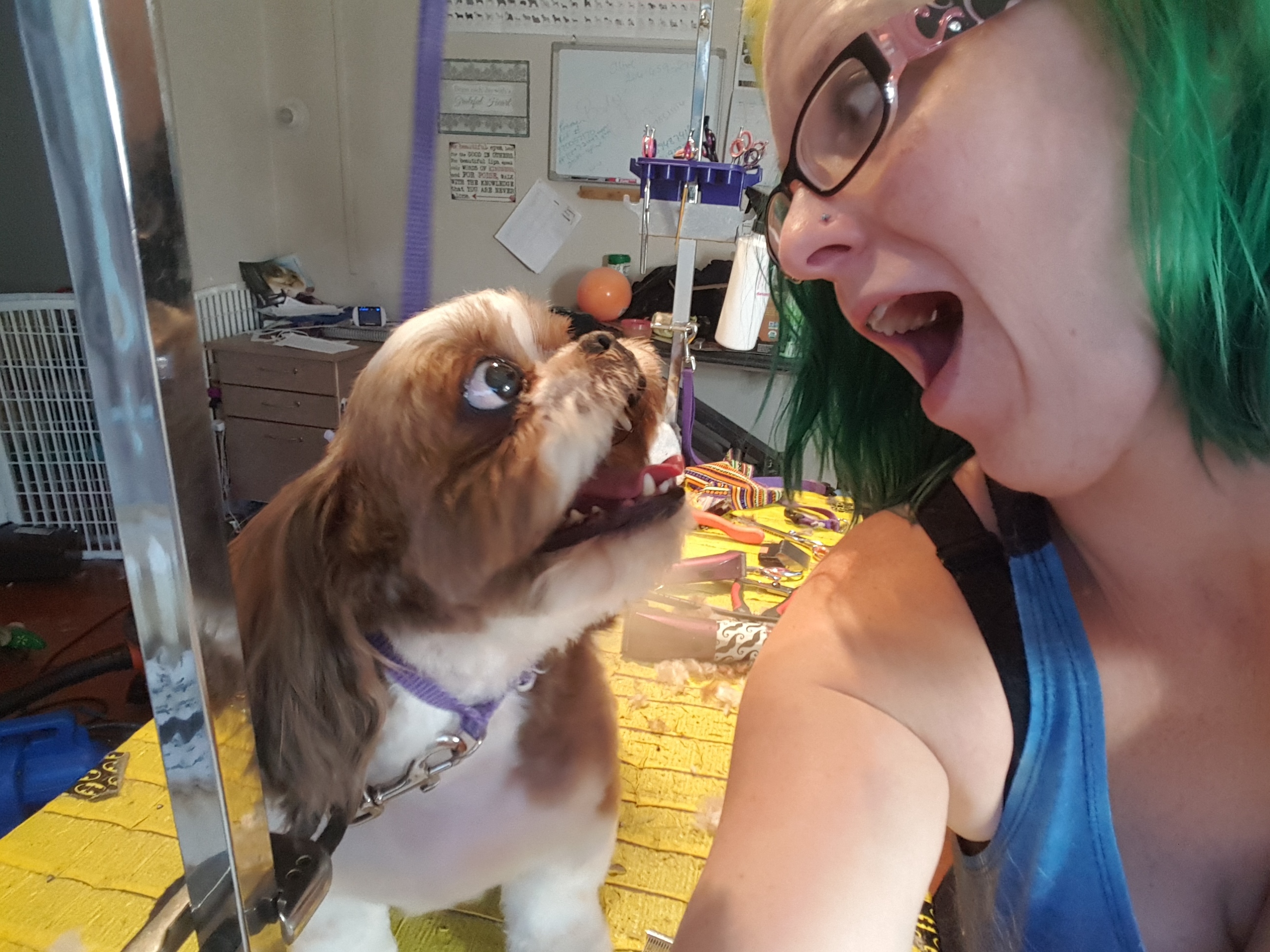 ▼美容師在網路論壇Imgur分享了這張照片,並寫道:「我昨天在外面遇見寵物美容店裡最喜歡的狗狗,但牠看起來好像很驚訝,我怎麼不是24小時住在美容院。」